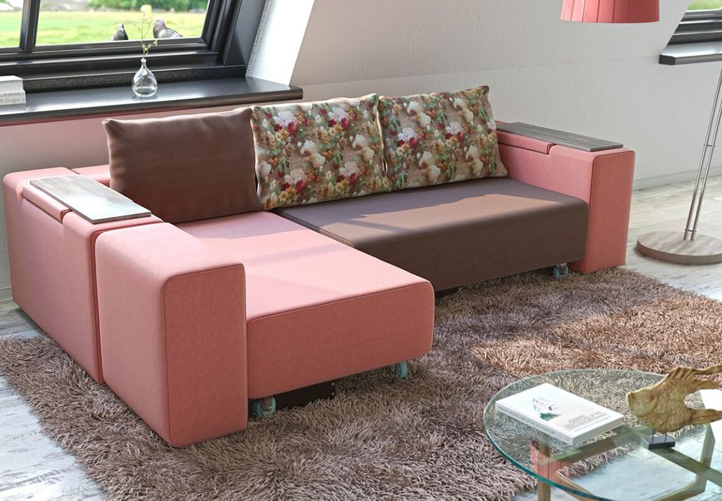 Немаловажную роль играет удобное и выгодное для пользователя оформление подлокотника, что позволяет использовать его вместо журнального столика и как подставку для напитков. Если необходимо, диван запросто превратится в кровать полного размера. Удобство оформления состоит еще и в том, что под угловой конструкцией, представляющей собой сиденье, располагается ящик для белья с удобным за счет подъемного механизма доступом.