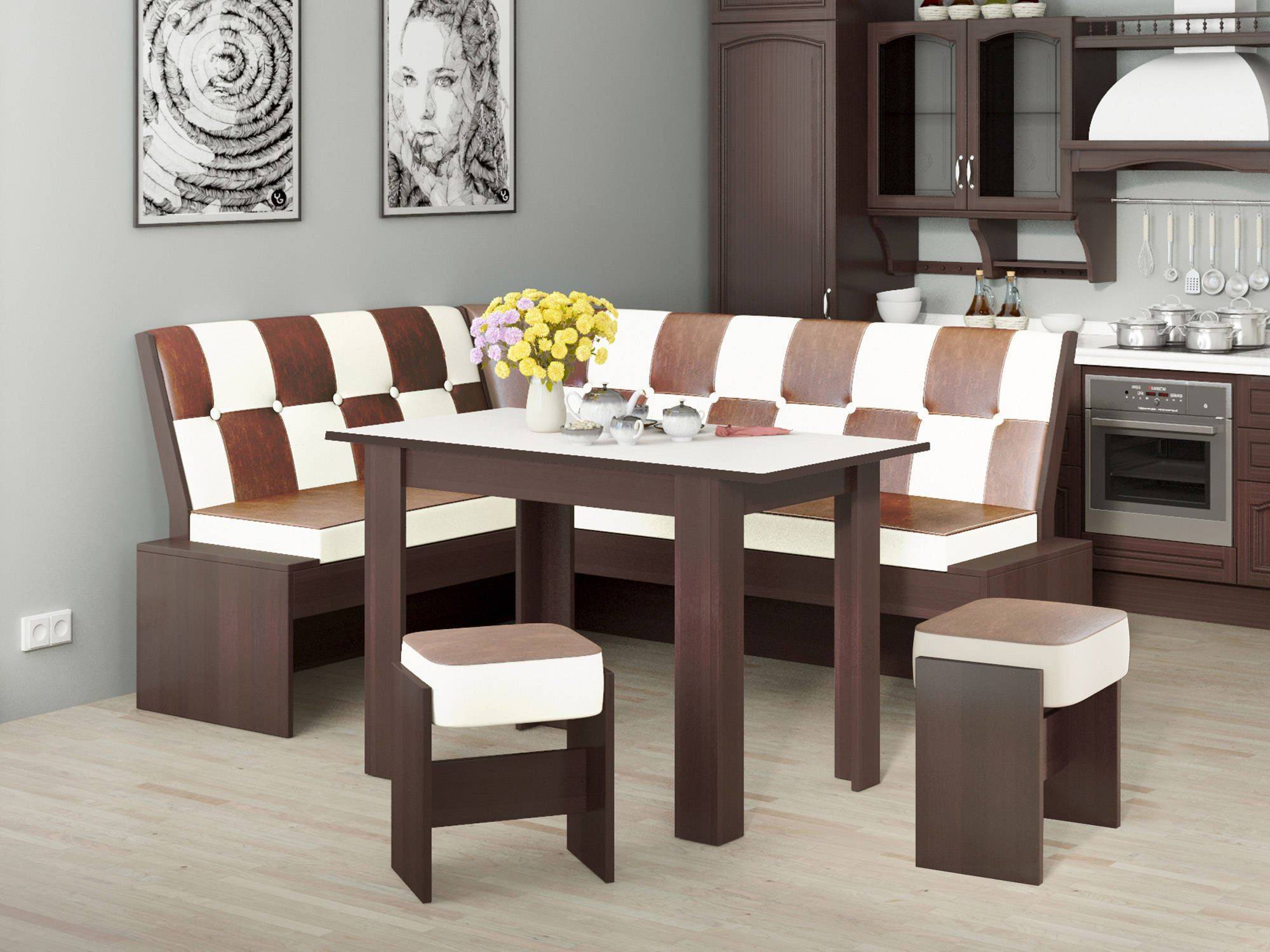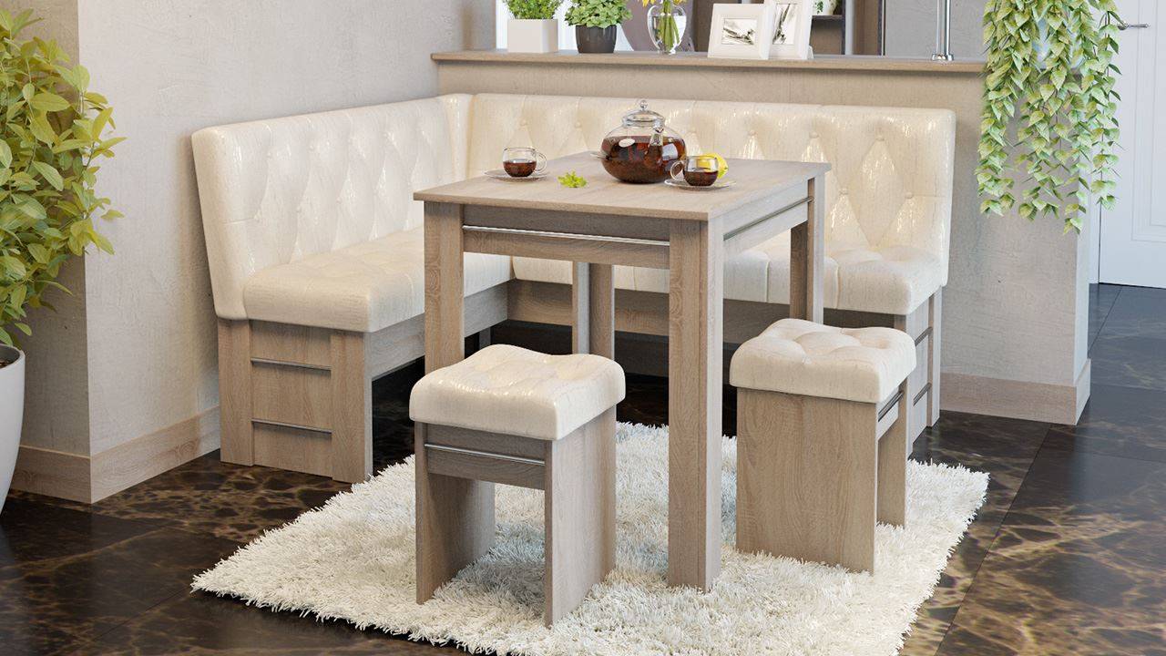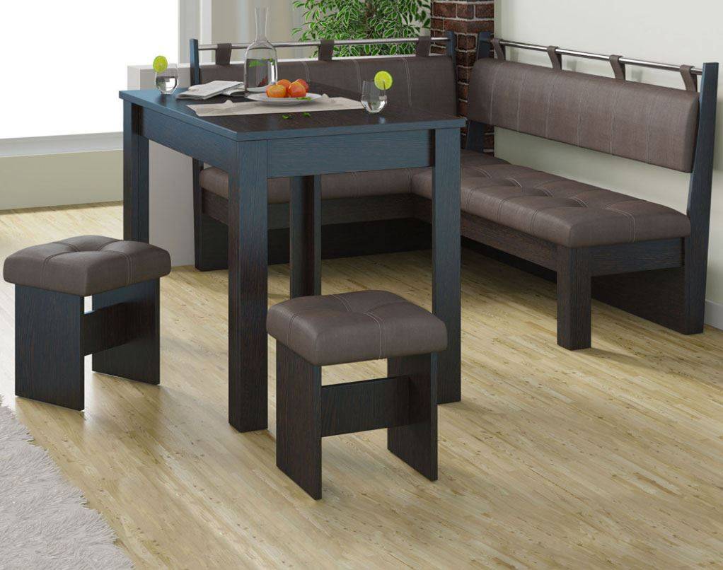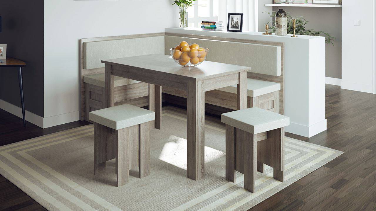 В стандартный комплект мебели для обустройства обеденной зоны входит стол, угловой диван и табуреты.