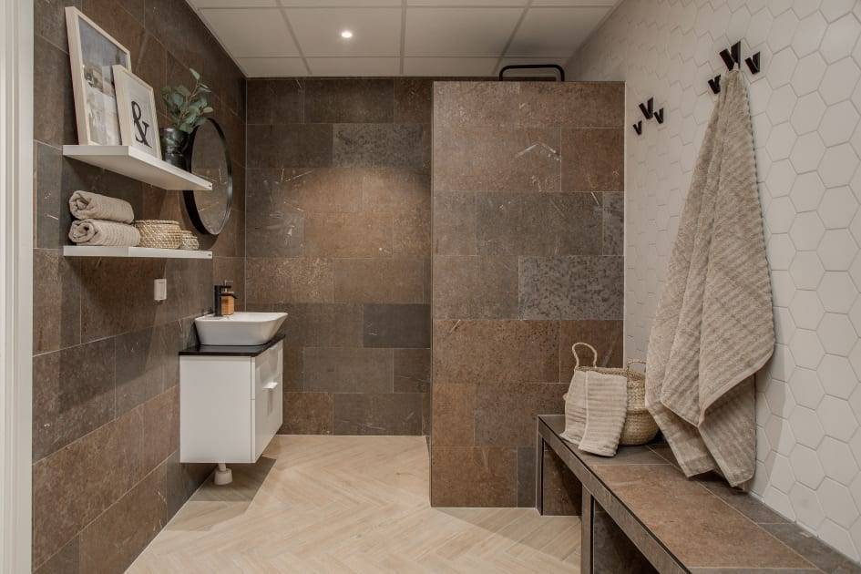 - Немаркий цвет упрощает уборку в комнате для купания. Светло-коричневый кафель или мебельные фасады маскируют следы от высохших брызг воды, отпечатков пальцев.
