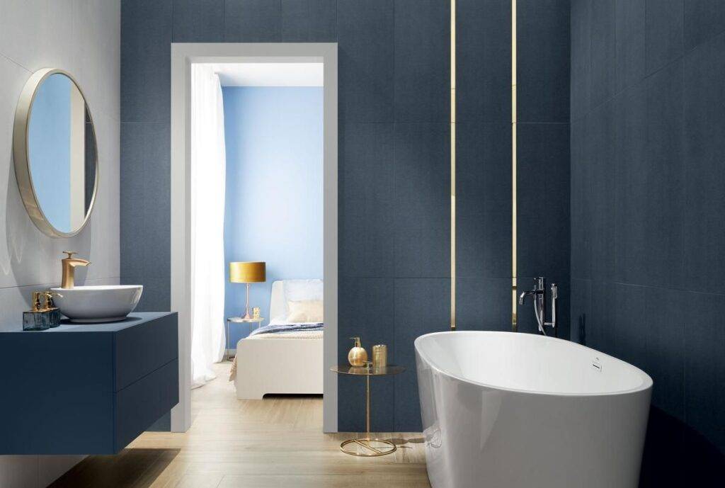 Морские оттенки синего можно найти, например, в коллекции Belike от Iris Ceramica. Серия доступна с отделкой Matt и Lux размером 60 × 20 см. Она сопровождается украшениями размером 20х20 см. Коллекция гибкая, вы можете создавать различные цветовые композиции и сочетать ее с такими материалами, как дерево и бетон.