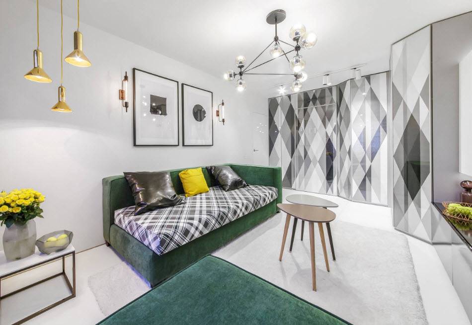 Травянистый зеленый прекрасно смотрится в черно-белой гостиной. Будут уместны все те же яркие детали, которые традиционно используются для декора. Но более гармоничным и изящным вариантом становится живая зелень – растения в кадках, целые стены или перегородки, увитые цветами. Оригинально смотрятся фигуры животных, выполненных из кустов или вьющихся растений по каркасу.