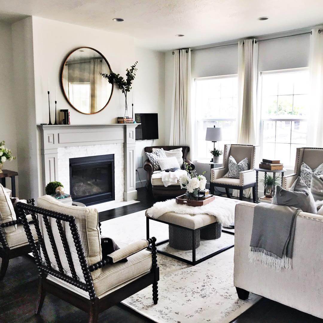 Совет! Планируя черно-белый колорит гостиной, учитывайте сторону света, на которую выходят окна комнаты и ее размеры.