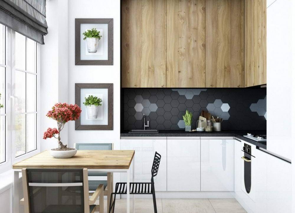 - небольшое кухонное пространство чаще всего оформляется в белом цвете, а черный тон используется фрагментарно, например, для исполнения столешниц, аксессуаров или в качестве принта кухонного фартука;