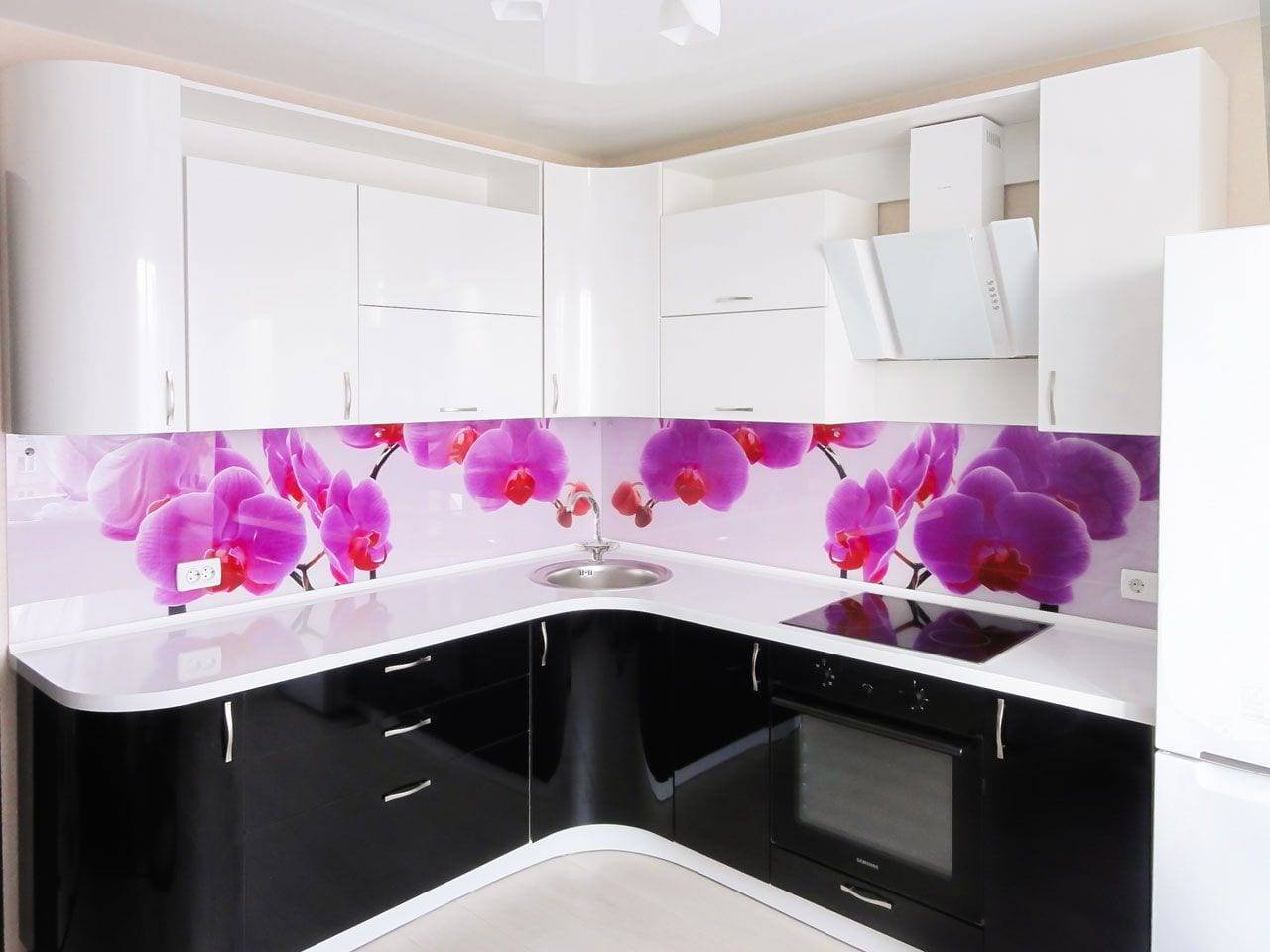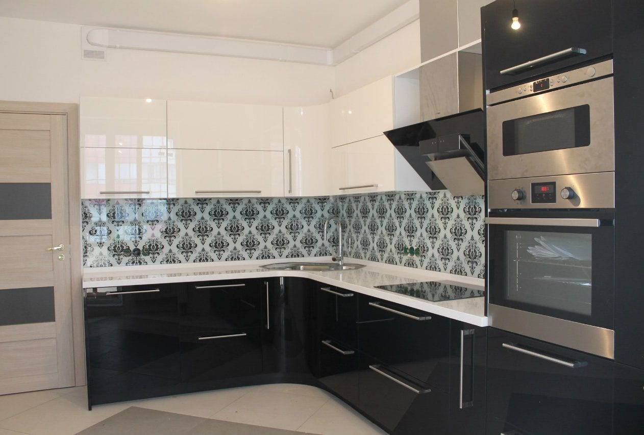 Красивый черный фартук на белой кухне с рисункомИсточник remontkit.ru