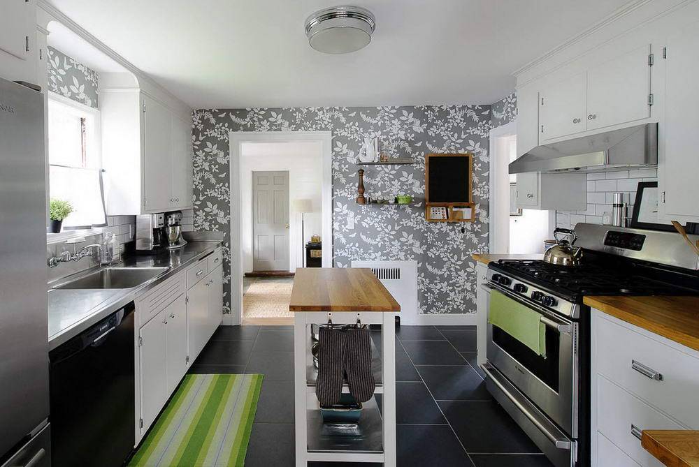 Под данный интерьер целесообразнее выбирать светлые плотные обои, которые позволяют наносить трафаретный рисунок или интересный живописный узор контрастного черного цвета. Естественно в продаже есть белые обои с уже готовым рисунком или узором черного цвета, но запечатлеть свое творчество может оказаться гораздо приятнее. Если решитесь самостоятельно наносить узоры на обои, то знайте, что слишком крупный узор может отвлекать от общей концепции дизайна кухни.