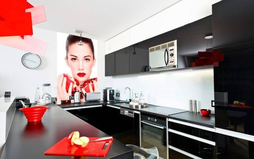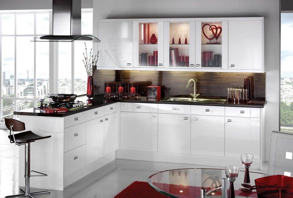 В красно-черных тонах следует сделать фасады гарнитура, а белый оттенок будет служить для них идеальным фоном. Что касается стиля интерьера, то он должен быть современным.