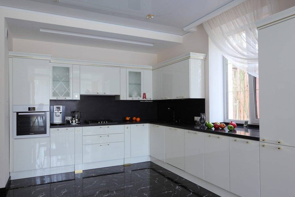 - Белая кухня и черный фартук. Наряду со столешницей имеет эффектный вид. Выделяет строгость отделки, является хорошим фоном для мебели, расположенной поверх и снизу этой области.