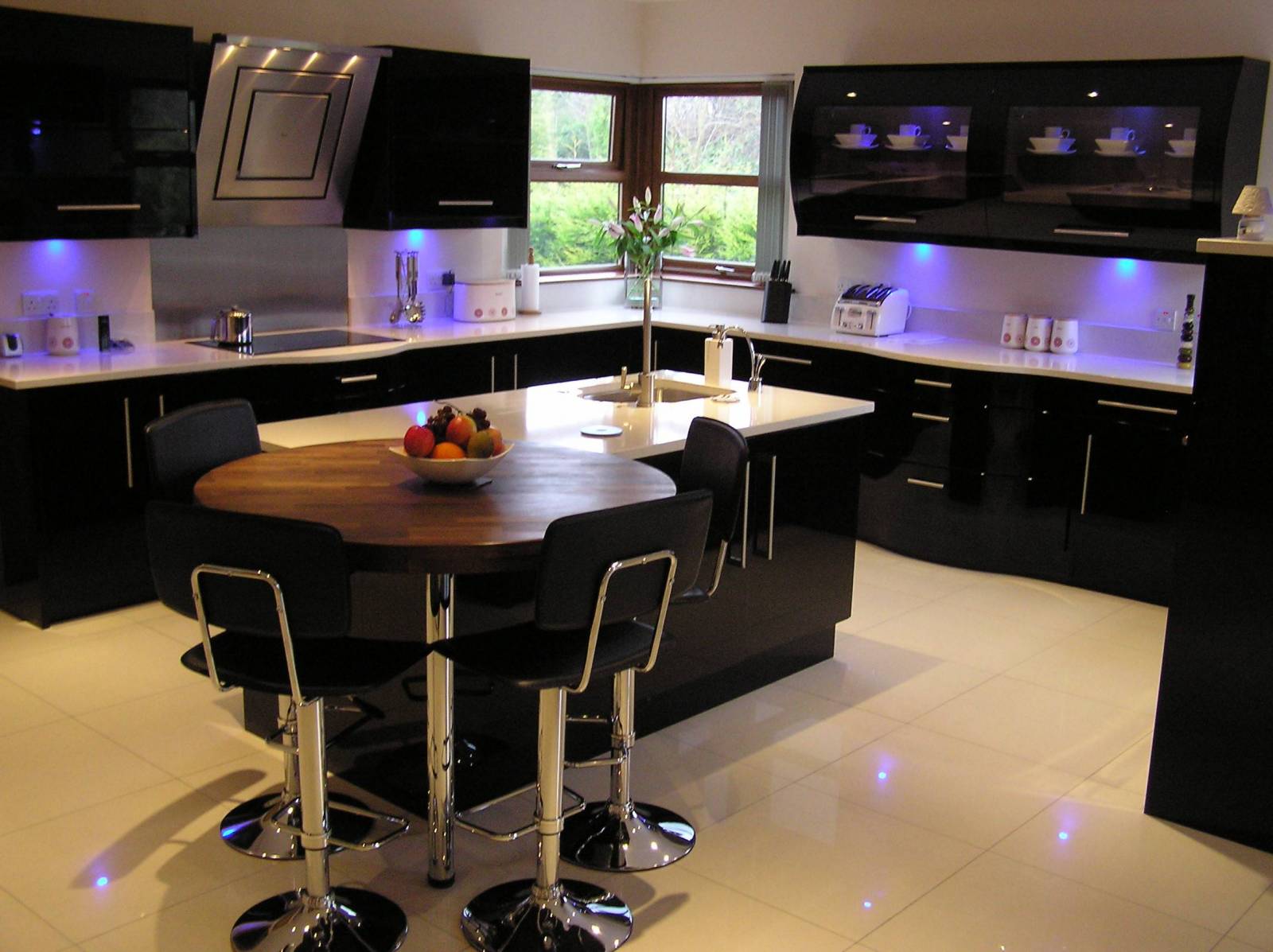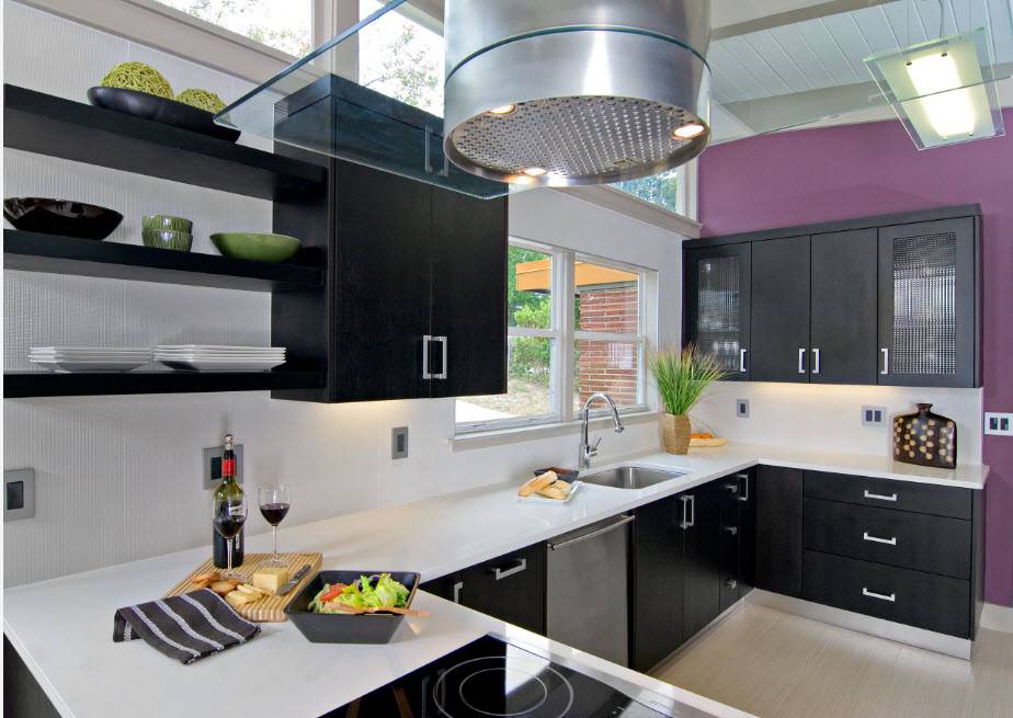 На потолке, который допустимо сделать глянцево-черным, присутствует несколько точечных светильников, над столешницами, одна из которых – островная, размещают лампу на длинном шнурке.