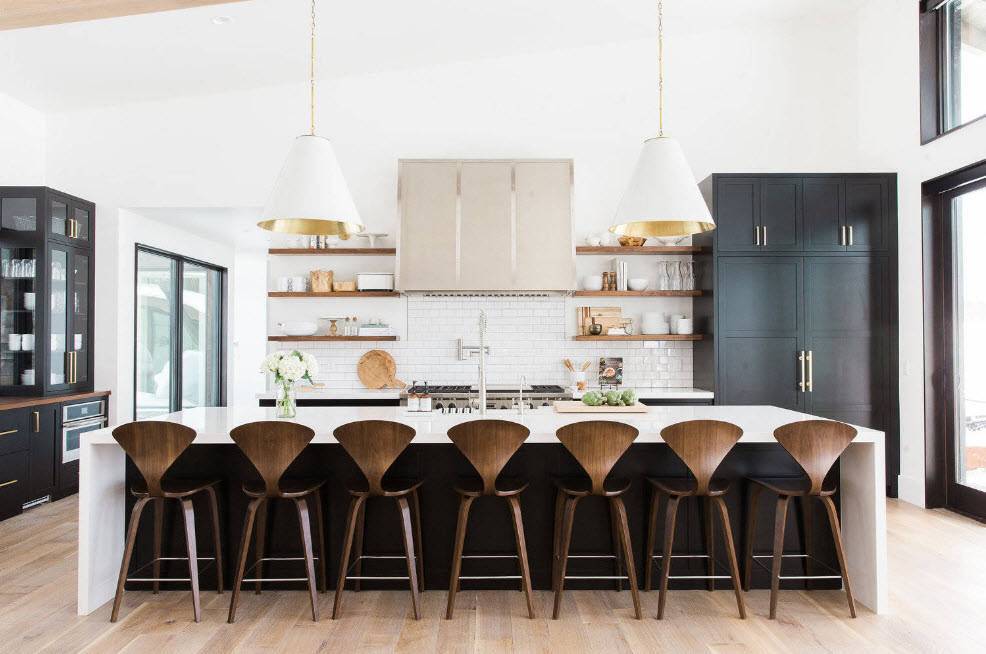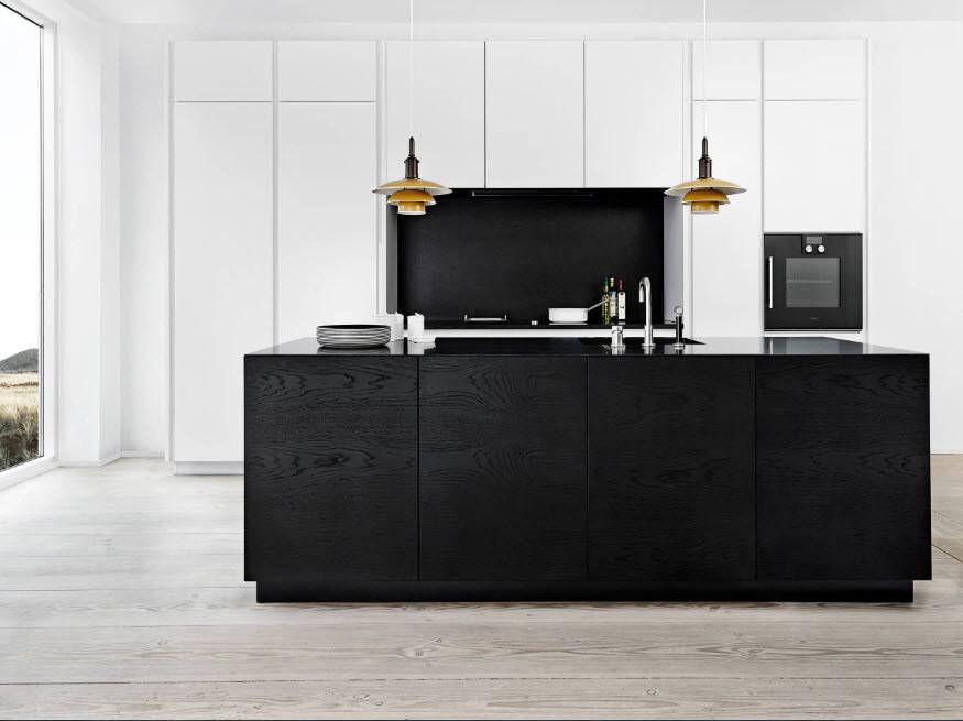 Дилемму, «какой из тонов должен стать доминантой в интерьере?» решить несложно – чем меньше помещение, тем больше белого цвета необходимо использовать при его оформлении, а черным тоном создать акценты, выделить наиболее удачные участки иди элементы. В просторных кухнях с большими окнами и обилием естественного освещения можно не ограничивать себя в использовании темного тона, не ограничиваться лишь фасадами систем хранения, а погружать в драматическую и при этом строгую атмосферу темноты целые зоны, функциональные сегменты. В помещениях средних размеров допустим расклад 50 на 50, но многое зависит не только от площади помещения, но и количества и размеров окон и дверных проемов, высоты потолка.