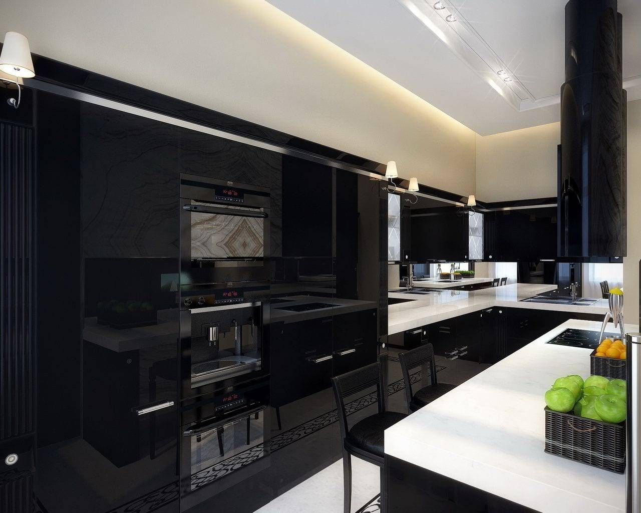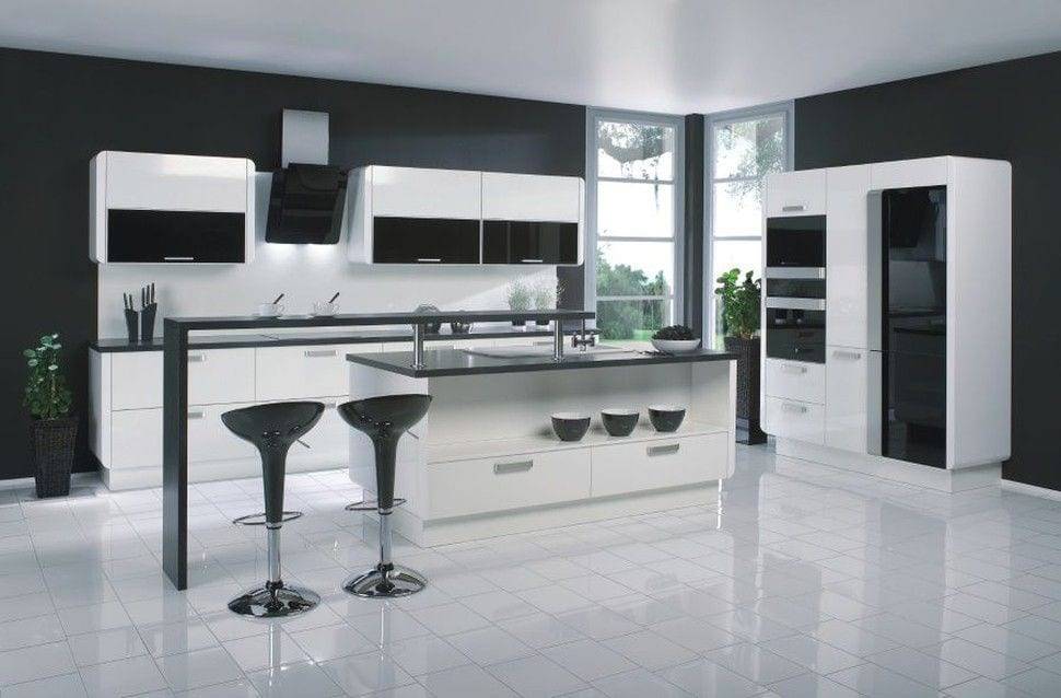 Шикарный интерьер кухни в стиле хайтек. Оформление в черно-белом варианте.
