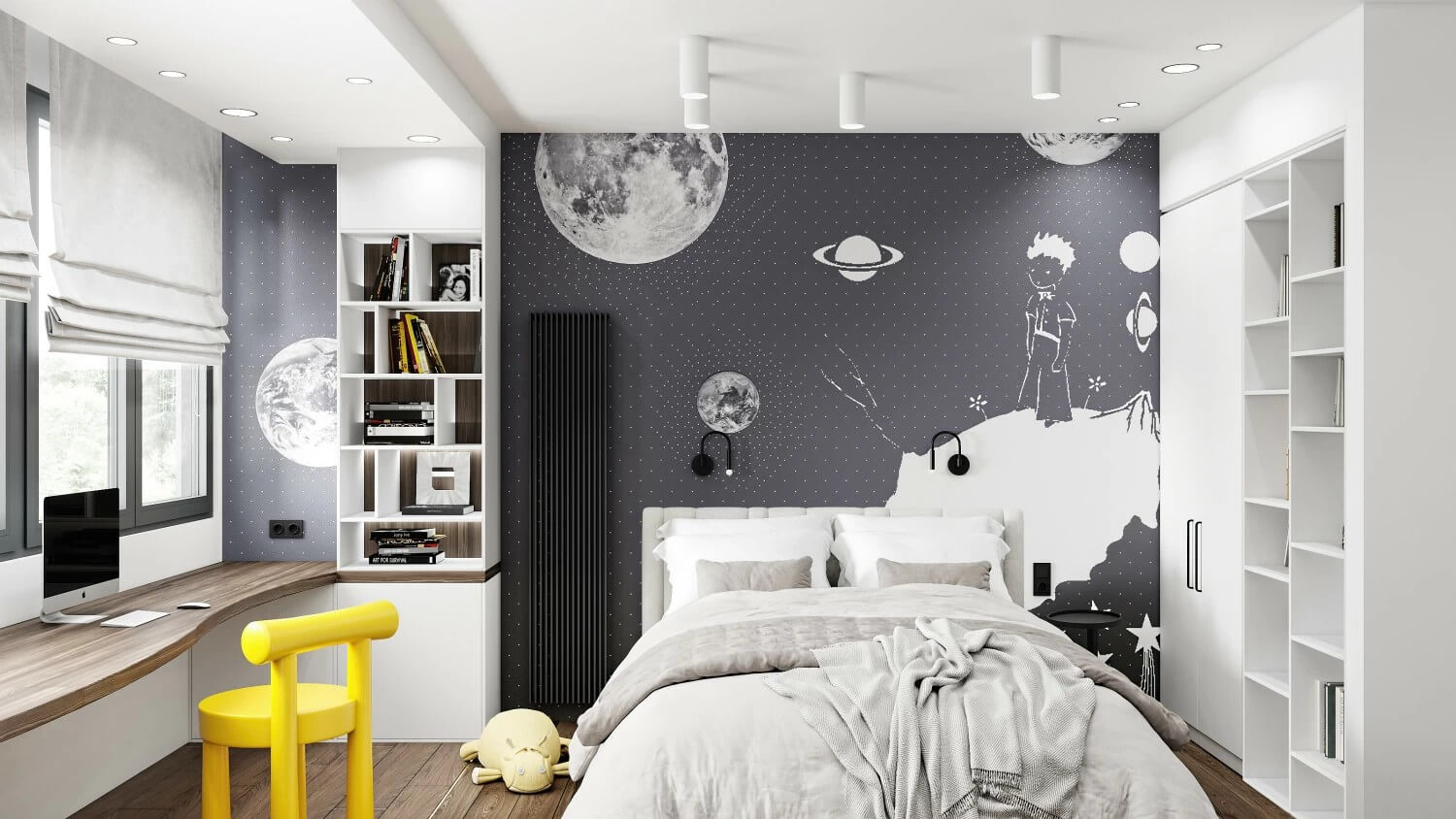 Нетривиальное решение — чёрно-белая гамма для оформления детской. Главное украшение комнаты — дизайнерский рисунок на стене по мотивам Экзюпери. А ещё на таком сдержанном фоне невероятно классно смотрится ярко-жёлтый стул. Проект квартиры “Shared space: 3 in 1”, дизайн — Mart Architects