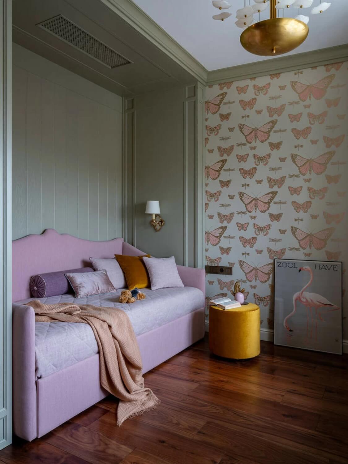 Оливково-зелёные деревянные панели мягко контрастируют с нежными бело-розовыми обоями. Такой романтичный интерьер оценят многие девочки. Квартира 240 м² с атмосферой загородного дома, дизайн — архитектурное бюро «Берлога»