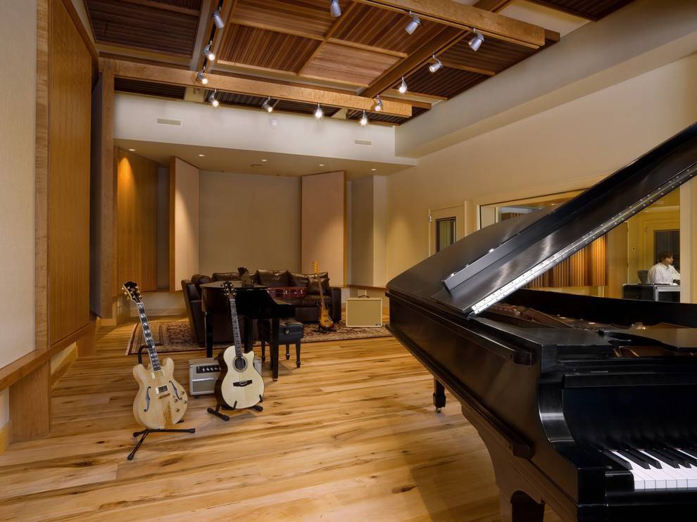Пространство, показанное здесь, использует хитроумное устройство, которое может изменять форму помещения. Распашные панели, видные на задней стене сцены, используются для тонкой настройки и контроля геометрии пути звукового потока, который в итоге отражается по всему помещению.