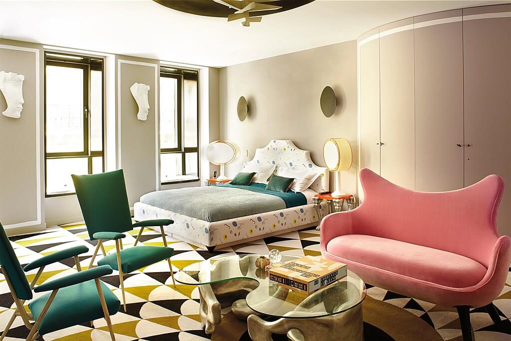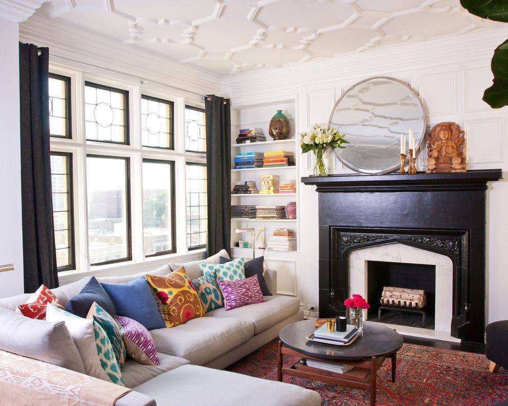 Классические признаки – лепная отделка, плавные линии дорогих светильников, задрапированные шторы, дополнены необычными элементами. В их числе – серые тона, сглаженные формы, выдвижные ящики кровати, геометрический узор ковра и диванных подушек, – все вместе создает одновременно практичный, красивый, современный дизайн.