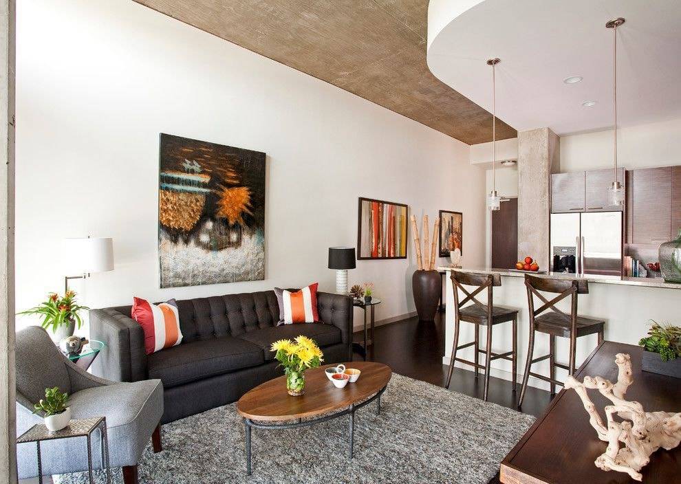 Еще один простой и дешевый способ разделить пространство в 25 кв. м — использовать большой предмет мебели. Диван является одним из лучших вариантов в этом отношении. Благодаря своей характерной форме он лучше определяет жилую площадь и функционирует почти как остров в пространстве. Добавьте журнальный столик, чтобы завершить организацию области гостиной!