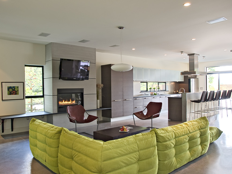 Своеобразным отделяющим барьером между кухней и мягкой зоной отдыха станет барная стойка. Свет и ощущение свежести, обилия воздуха в пространстве обеспечат панорамные окна с видом на сад.