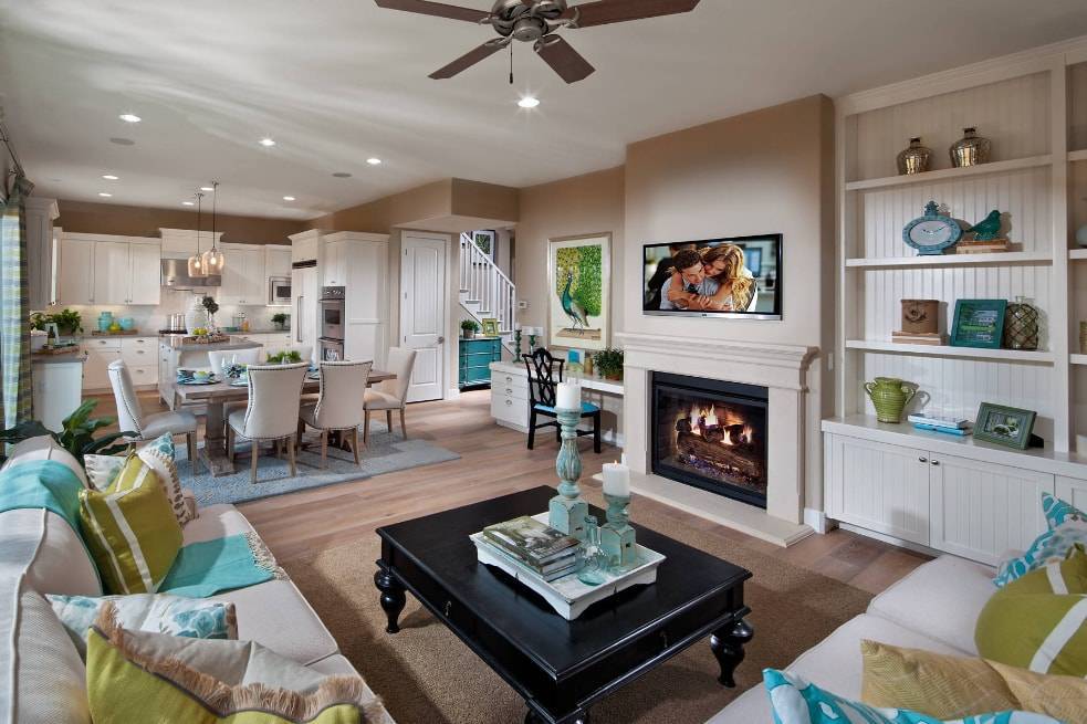 Дизайн этой зоны менее практичен и направлен на комфорт. Центральным персонажем гостиной обычно выступает диван, напротив которого находится стена с камином или телевизором. Но его заменят и несколько удобных кресел-мешков или пуфов. Обладателей небольших комнат заинтересуют столы-трансформеры, складывающиеся по принципу матрешки стулья, другие современные решения. Отличная идея для экономии места – разделяющий кухню и гостиную стеллаж или встроенный шкаф с открытыми и закрытыми полками, подходящий для помещений в классическом стиле.