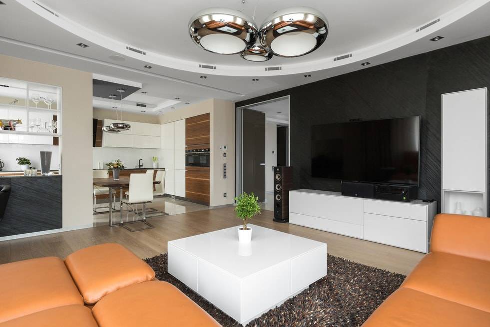 По центру помещения, сочетая его с журнальным столиком. Рядом можно расположить люстры, светильники. За ним обеденный стол или барную стойку.
