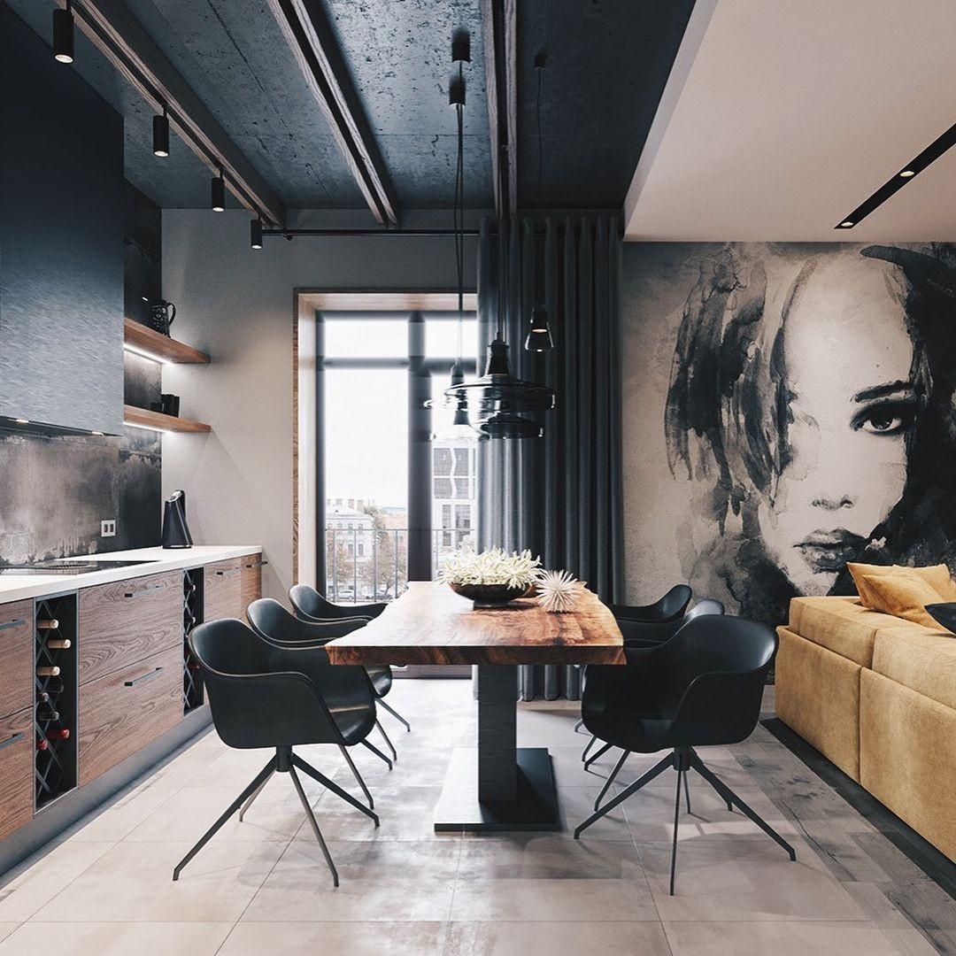 Интересная интерпретация стиля лофт. С одной стороны, кирпичная стена и довольно объемные лампы. Но с другой стороны в этих же лампах внутри спрятаны шикарные хрустальные люстры. А стену украшают голова оленя и рога из железа. В то же время бархатный диван и шелковые подушки и вовсе выбиваются из привычного понимания стиля лофт. Не смотря на все эти противоречия, дизайн интерьера выполнен прекрасно и кухня-гостиная выглядит очень стильно, привлекательно и необычно.