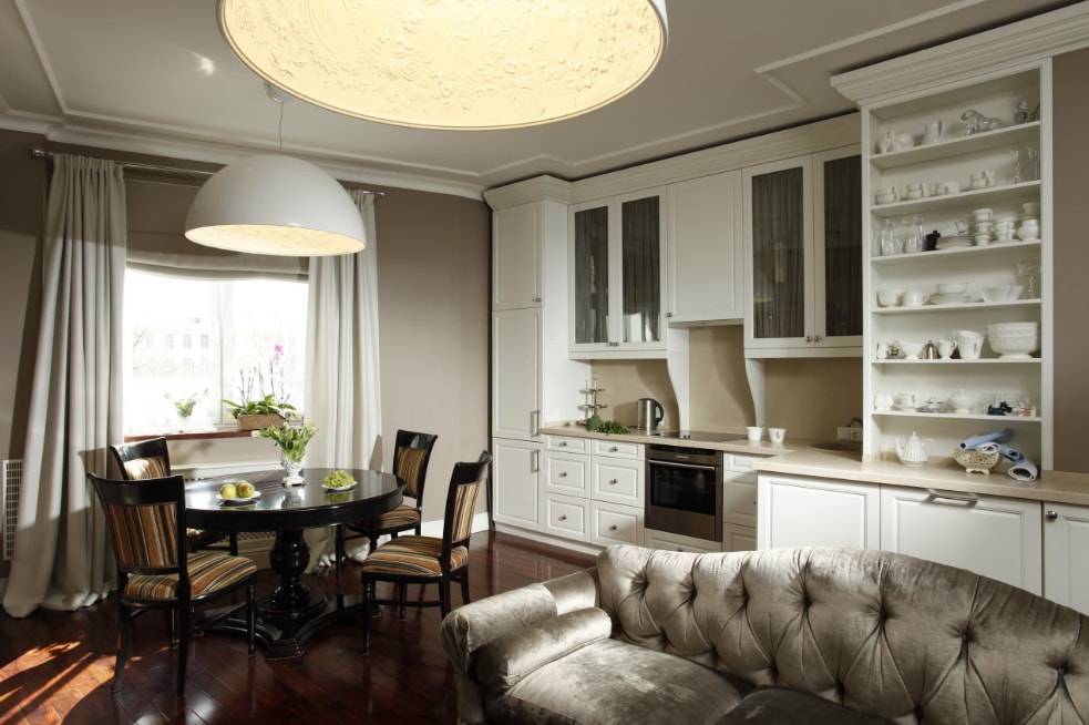 Хорошо подойдет классика для кухонь, совмещенных с гостиной. Фото демонстрируют идеально четкие линии, дорогую деревянную мебель, отсутствие лишних деталей и однотонные светлые стены.