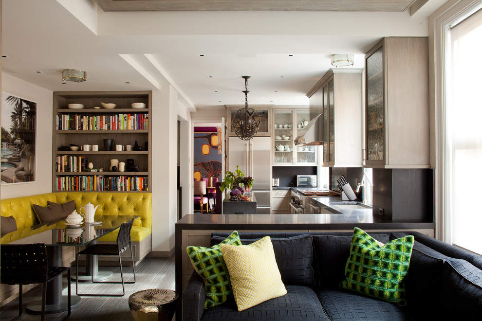 Вместо обеденного стола на границе между зонами располагают мягкий уголок для удобного расположения всех членов семьи. В просторном помещении обеденная зона может быть совмещена с диваном, спинкой повернутым к кухне.