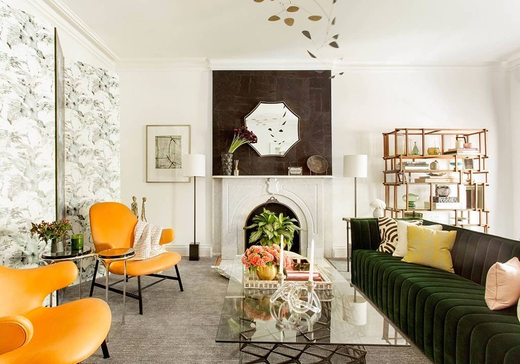 На фото приглушенные горчичные и изумрудные аксессуары в зале