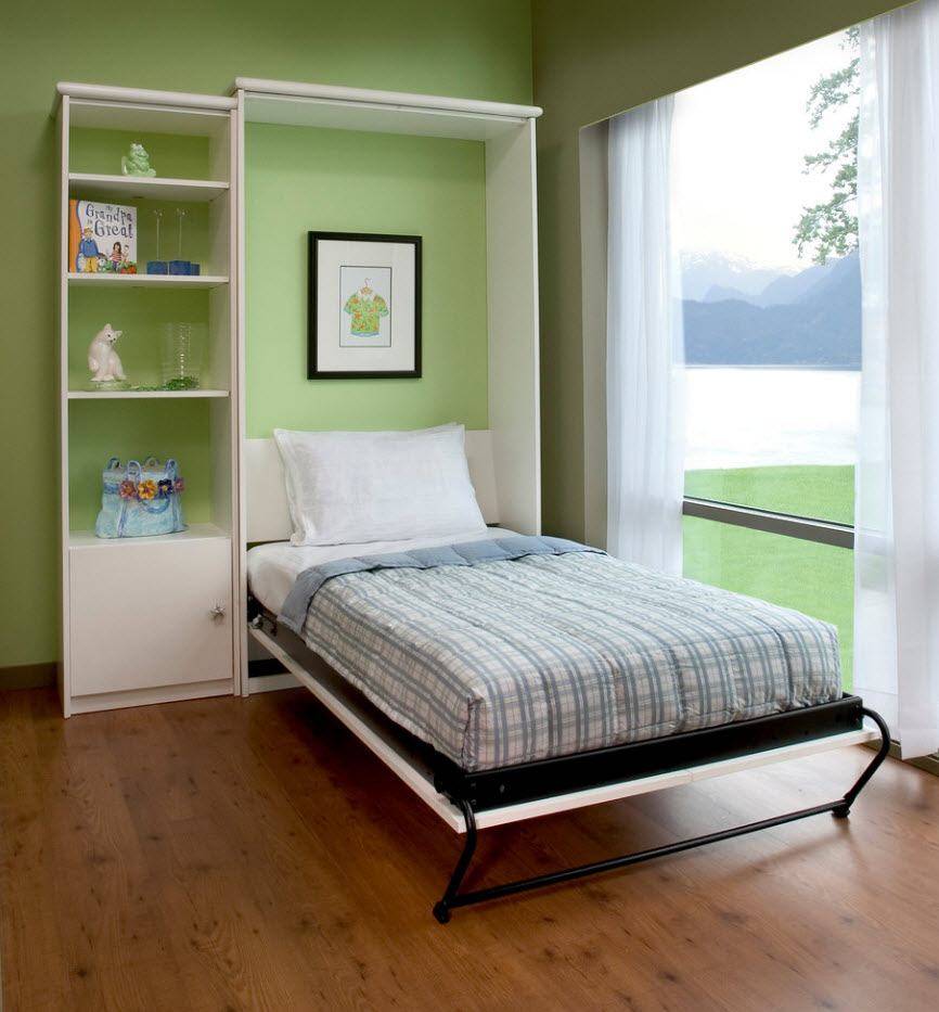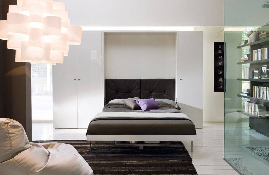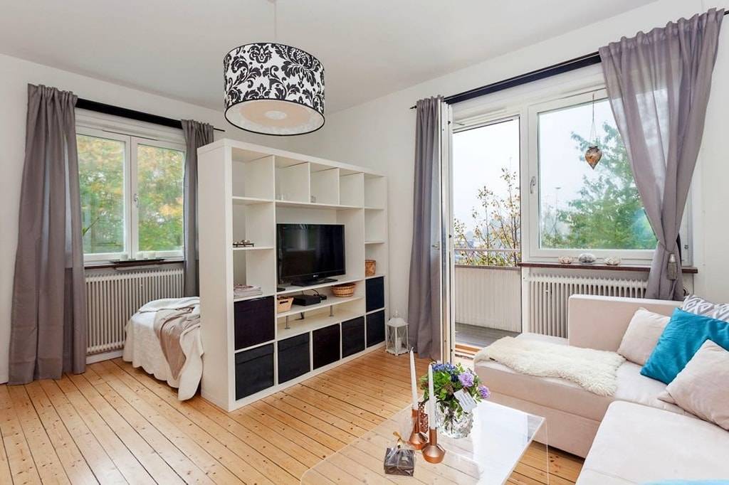 - Для рационального разделения можно использовать шкафы и стеллажи. Особенно хорошо подойдут диван-стеллаж или кровать-шкаф.