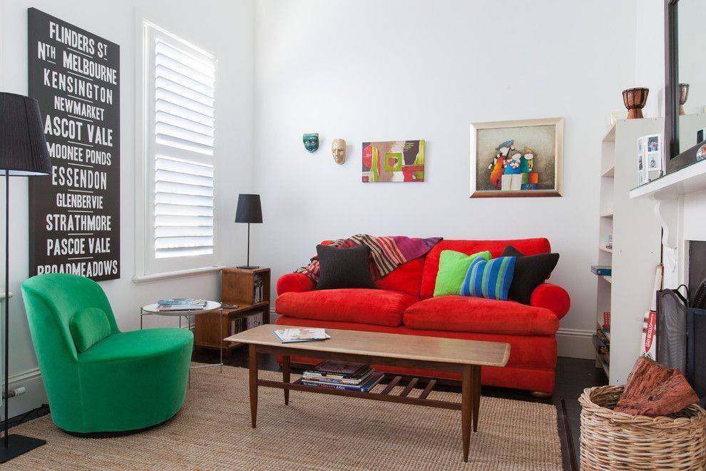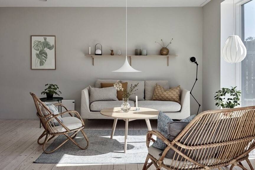 Предметы обстановки не должны мешать и захламлять комнату. Откажитесь от массивных предметов в пользу легких и компактных. Размер тоже важен — слишком крупные предметы мебели визуально уменьшают комнату. Выбирайте небольшие вещи. Замысловатая форма также может перегрузить пространство, лучше, если диван или кресло будут простой формы. Делайте ставку на светлую однотонную обивку — это беспроигрышный вариант. Если хочется добавить цвета, это легко сделать с помощью декоративных подушек.