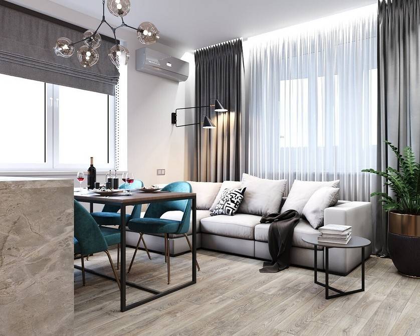 Интерьерное решение, пользующееся неизменной популярностью. Грамотно распределенная мебель и предметы декора позволяют сэкономить массу дефицитного пространства.