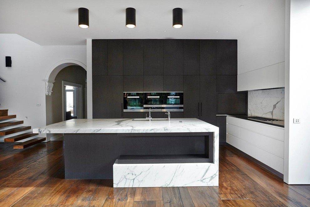Что касается выбора материалов и поверхностей покрытия для кухни в современных домах, то все чаще используются натуральную и органическую отделку. Вы можете увидеть это не только в напольных и настенных покрытиях, но и на кухонных столешницах. Настенные покрытия, облицовка стен и деревянные столешницы остаются очень модными в современном кухонном декоре. Еще один очень популярный материал — камень. Он имеется в различных формах, наиболее интересным из которых является мрамор. Нержавеющая сталь в течение многих лет доминирует на кухнях оставаясь популярным решением для некоторых деталей, таких как, например, вытяжки.