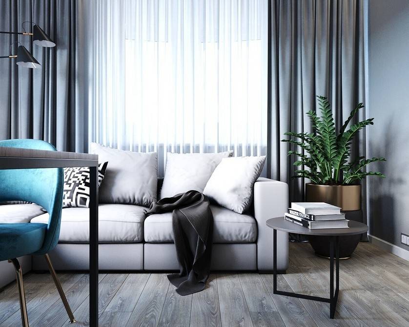 При выборе мебели останавливайтесь на гарнитурах без излишков отделки и предметах, рационально сочетающих функциональность и элегантность внешнего вида. Цветовое решение современных гостиных и спален в одной комнате базируется на коричневых, синих, бежевых и других натуральных оттенках.