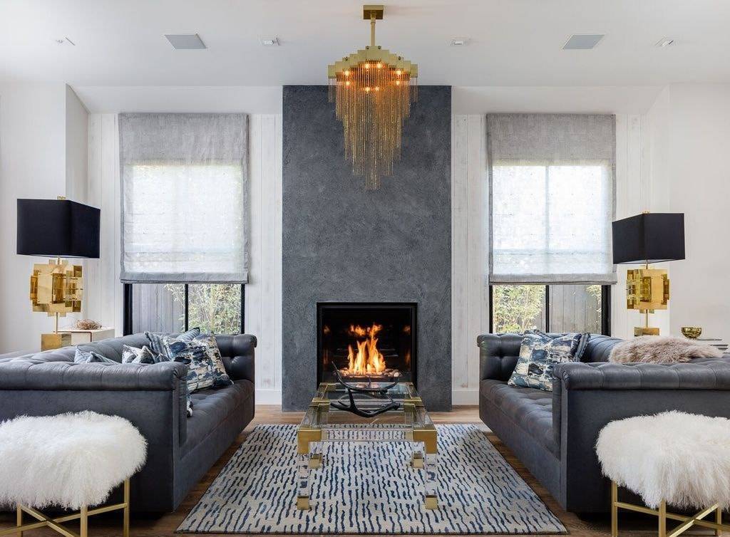 - Дизайн камина должен сочетаться со всей стилистикой гостиной: современная отделка комнаты будет сочетаться с термостойким стеклом и пластиком.