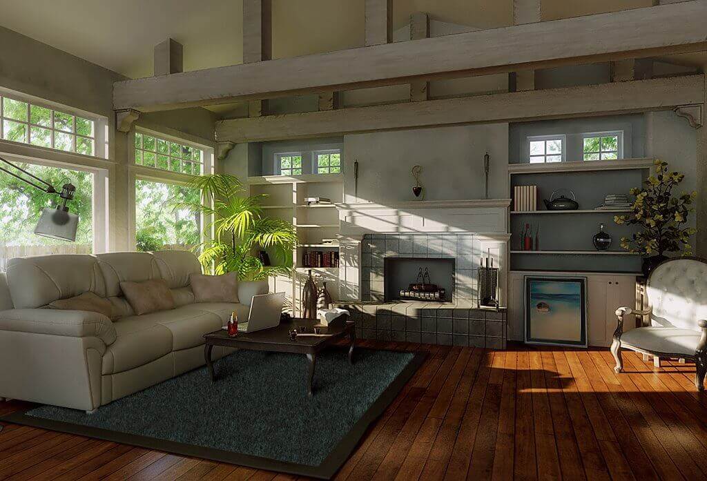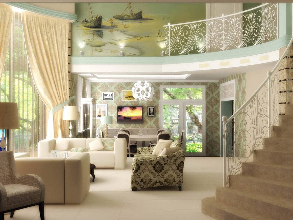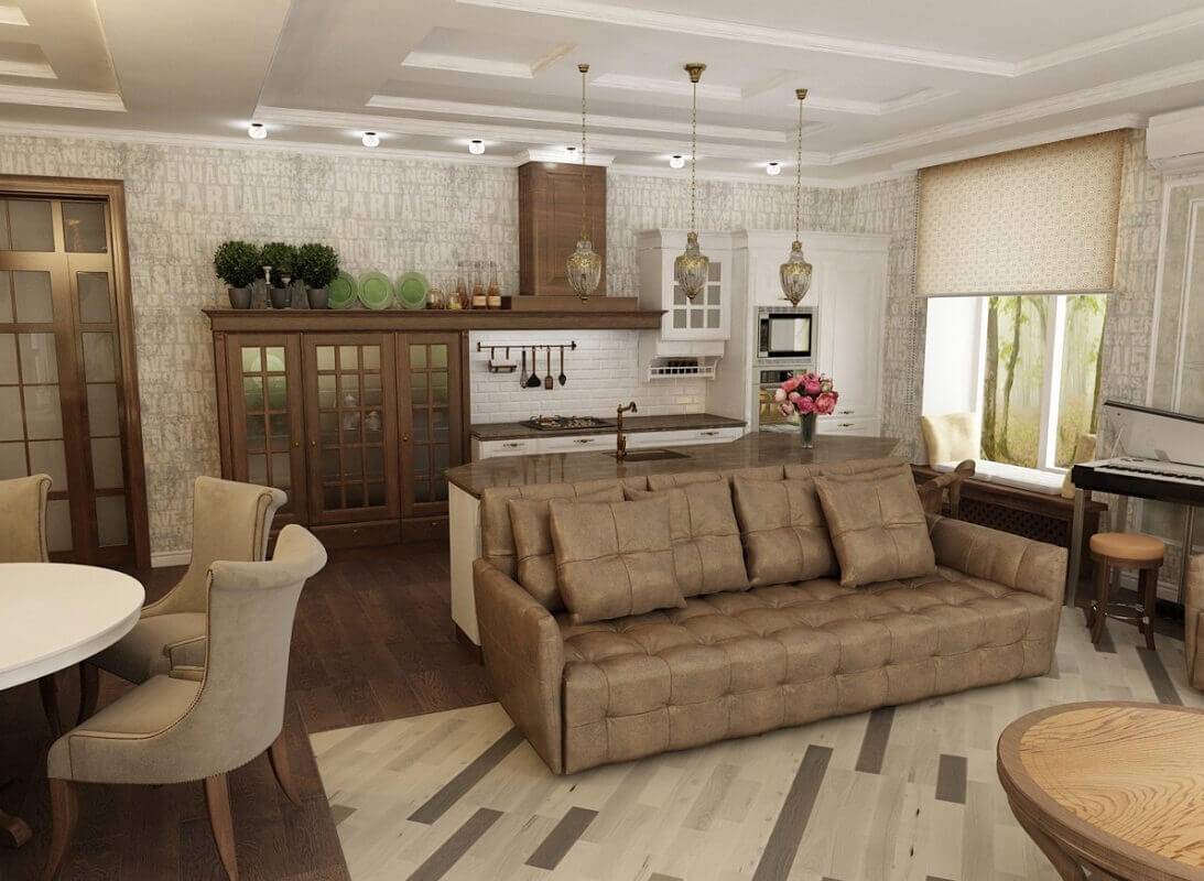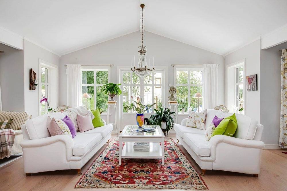 При обустройстве гостиной нужно учитывать количество окон, уровень освещения, число дверных проемов, наличие лестницы и саму конфигурацию комнаты. Для частного дома подходят такие стили, как: