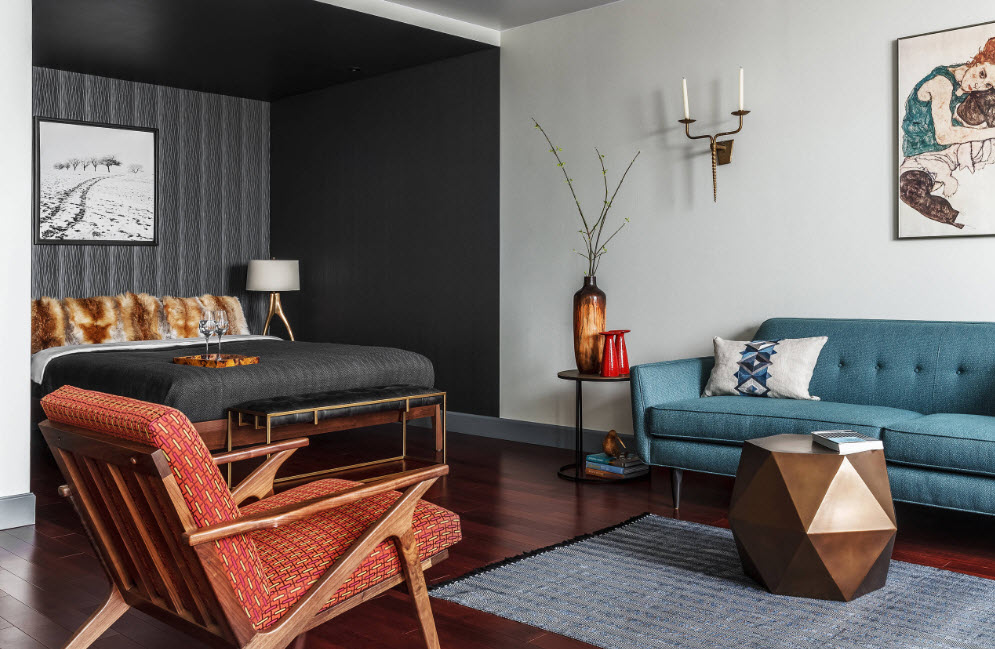 - Можно использовать прямые линии, темные пятна, контрастно резать пространство. Визуально правильный прямоугольник комнаты разбивается на части, взаимоисключающие друг друга.
