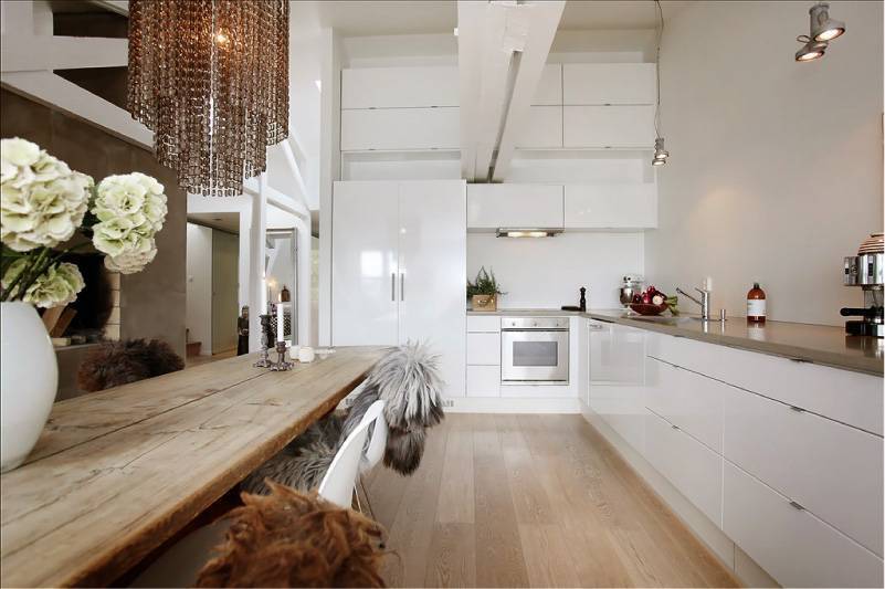 Натуральные материалы – придадут изысканности, кухня с натуральным деревянным полом выглядит статусно, такое решение предлагается использовать преимущественно для комнат с большой квадратурой.