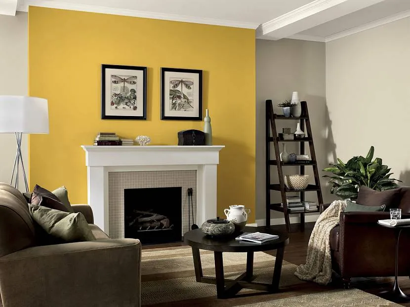 Камин на фоне желтой стены гостинойИсточник journal.homemania.ru