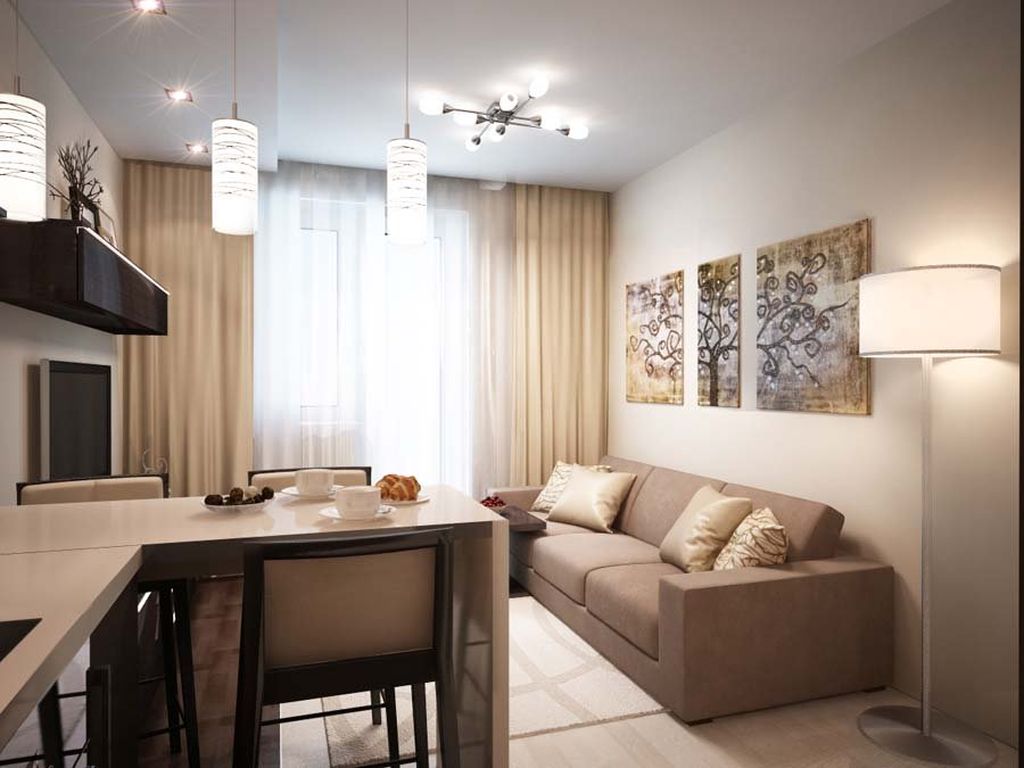 Полноценную гостиную в малогабаритной квартире можно сделать, забрав площадь у другого помещения (например, кухни или балкона). Проекты совмещенных комнат получили огромную популярность, их можно найти в огромном количестве. Самая большая сложность состоит в демонтаже перекрытий и последующей отделке. Но зато после такого ремонта получается красивая и функциональная гостиная.