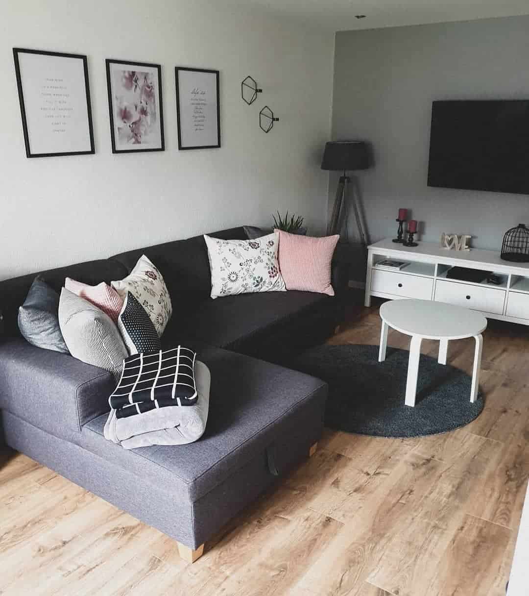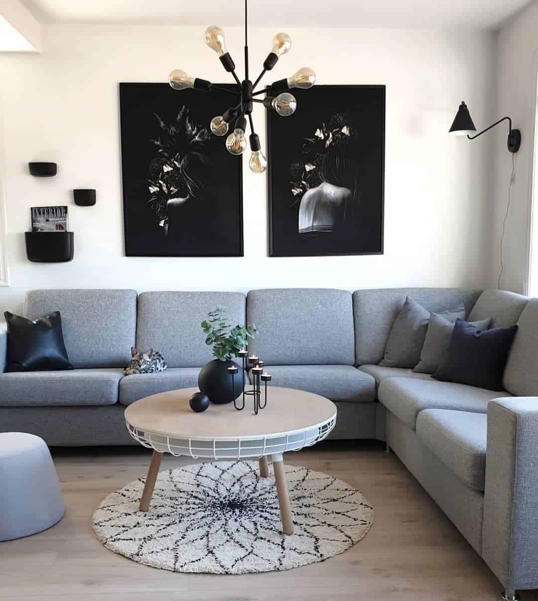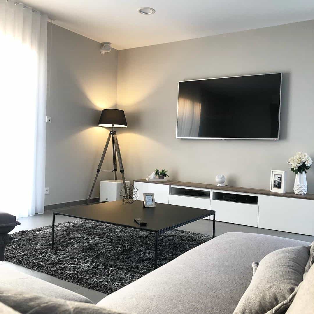Зал в оттенках серого не должен выглядеть чересчур мрачно, поэтому тёмными тонами лучше слишком не увлекаться. Их можно разбавить белым или бежевым.