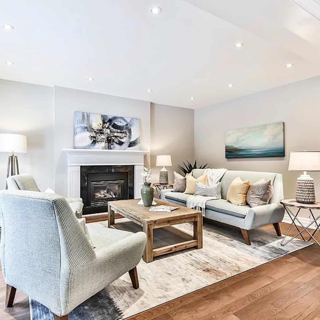 Синий и голубой хорошо сочетаются с бежевым, белым и серым. Такая тональность обеспечит гостиной свежий и неперегруженный вид, который порадует взгляд.