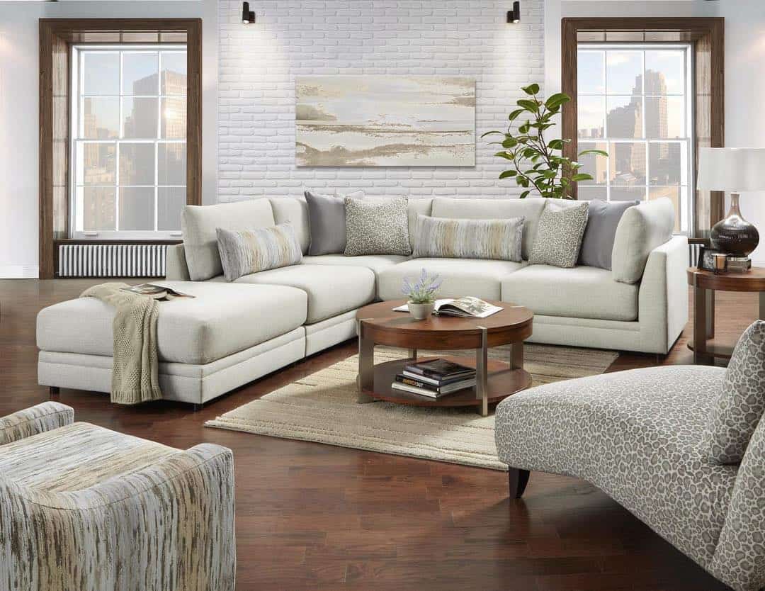 Хотя светлой мебели часто требуется особое внимание, выйти из положения можно, выбрав серый или песочный оттенок обивки