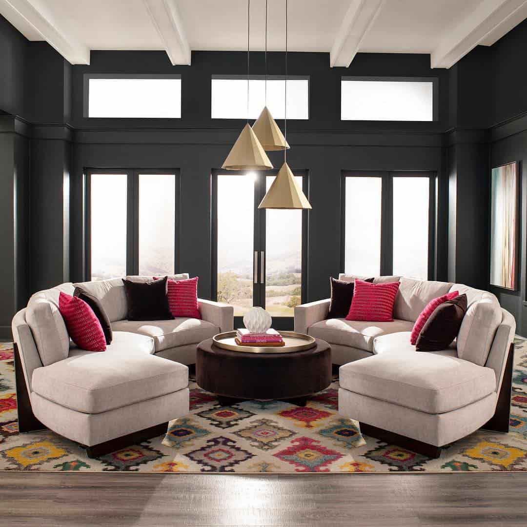 При обустройстве такой комнаты большое внимание уделяют ее пропорциям. Мебельные предметы располагают примерно на равном расстоянии друг от друга, чтобы идеальные параметры квадратной гостиной не утратили свои достоинства