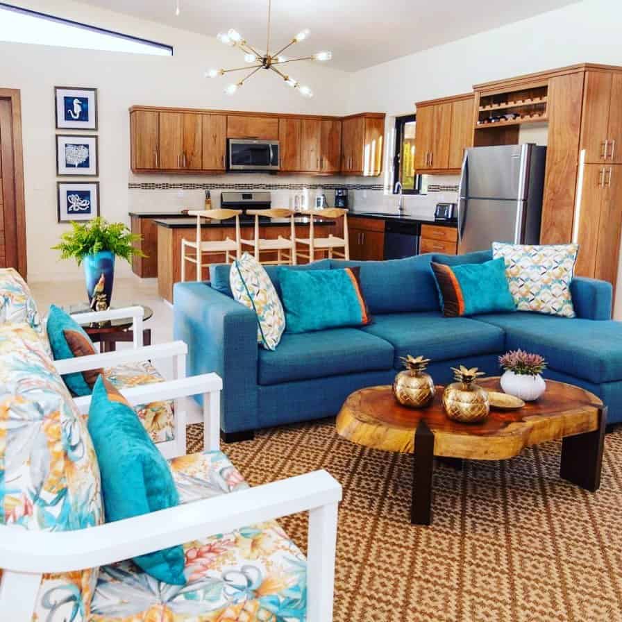 Прохладные морские оттенки хорошо разбавят тон гостиной, окна которой ориентированы на юг. Такая гамма словно приглушит переизбыток солнца.