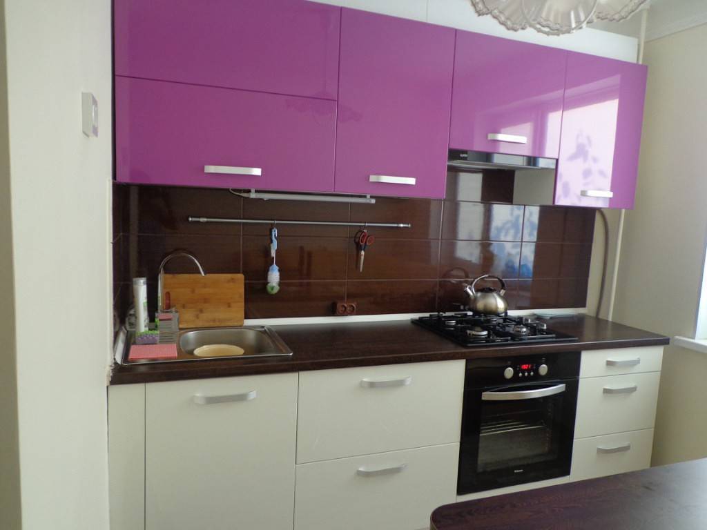 Отличный вариант для обустройства кухни — выполнить только нижние или только верхние фасады кухни в фиолетовых тонах. Остальная часть может быть белой, серой, лиловой. Что касается материала изготовления такого гарнитура, то тут следует руководствоваться выбранным стилем интерьера.