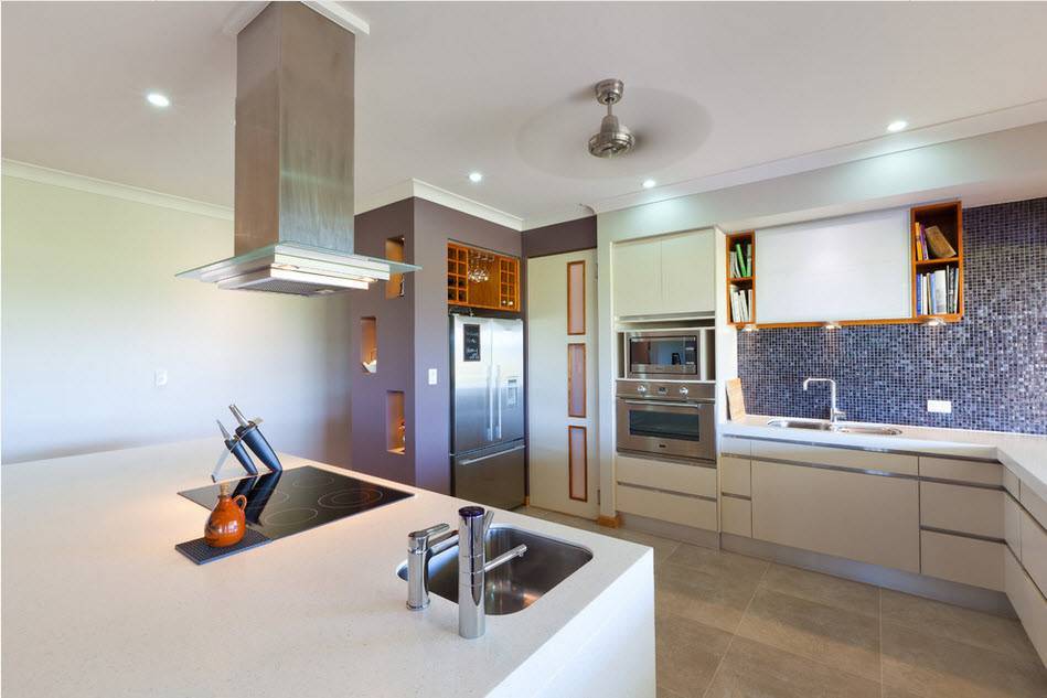 Не будет кухня, исполненная в черно-фиолетовых тонах, и светлой. Поэтому – максимум внимания освещению, не только центральному, но и в рабочих зонах.