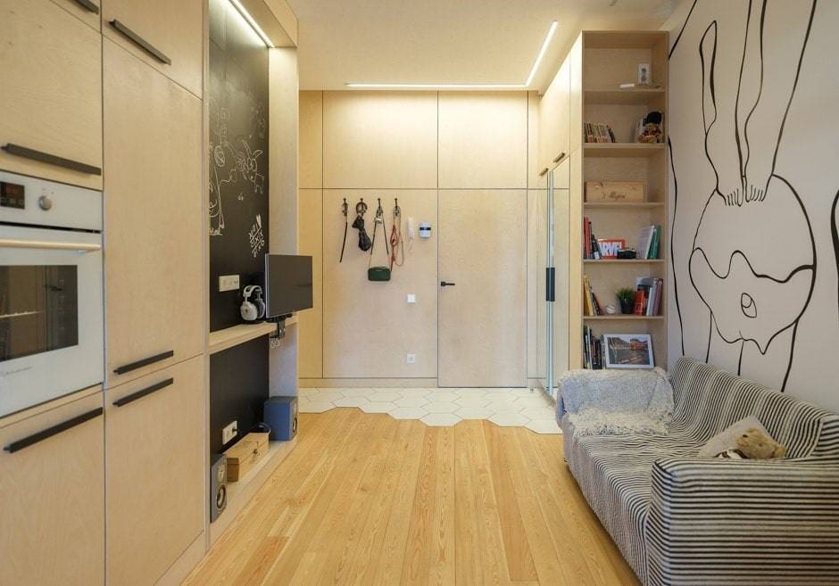 Главное предложение дизайнера – максимальное использование небольшого пространства. Дизайн квартиры-студии площадью 20 квадратных метров, представленный на фото ниже, детально продуман. Здесь находится множество умных решений. Архитекторы доказывают, что студию можно оформить приятной, удобной.