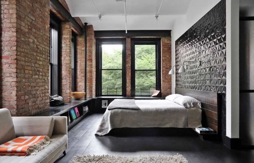 Спальня 12 кв. м. с кроватью, телевизором и платяным шкафом, дизайн которой поразит своей дерзостью и нарочитой брутальностью, приобретет уникальные черты в стиле чердачного лофта. Вместе с тем интерьер отличается мягким уютом и поразительным комфортом.