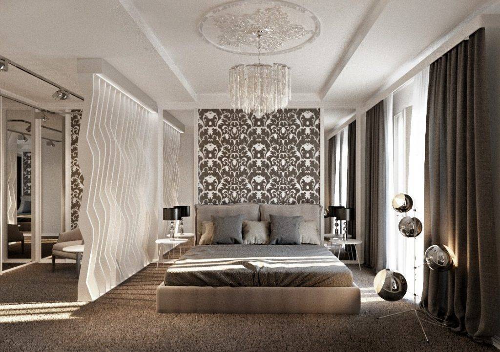 Декор спальни в стиле модерн не должен быть громоздким, но в нем должны присутствовать ультрамодные мебельные гарнитуры с «королевскими» мотивами. Стены должны быть отделаны современными материалами – текстилем, трафаретной печатью.