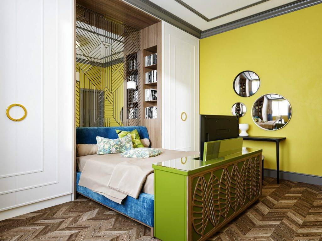 Дизайн комнаты можно сделать в ярком голубом цвете