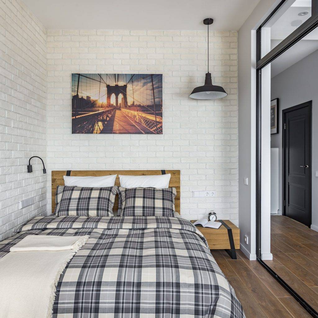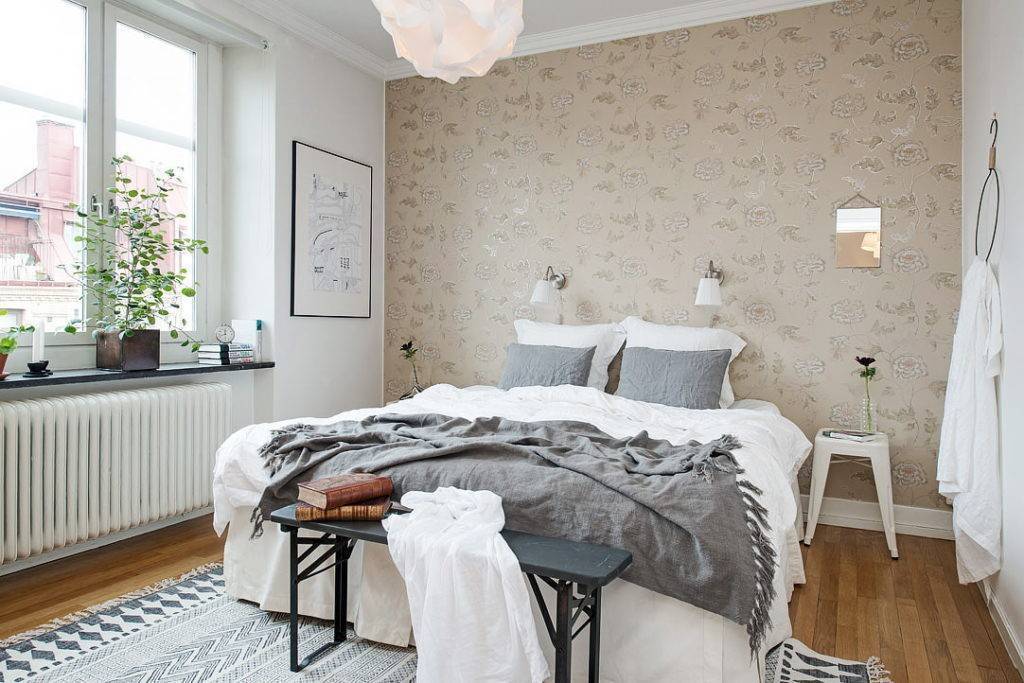 Простой текстиль, тюль на окнах, минималистичные светильники – это всё о скандинавском стиле. Кровать должна быть достаточно массивной, но простых форм. Расположите на ней побольше подушек и постелите тёплый плед.