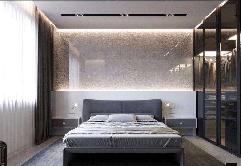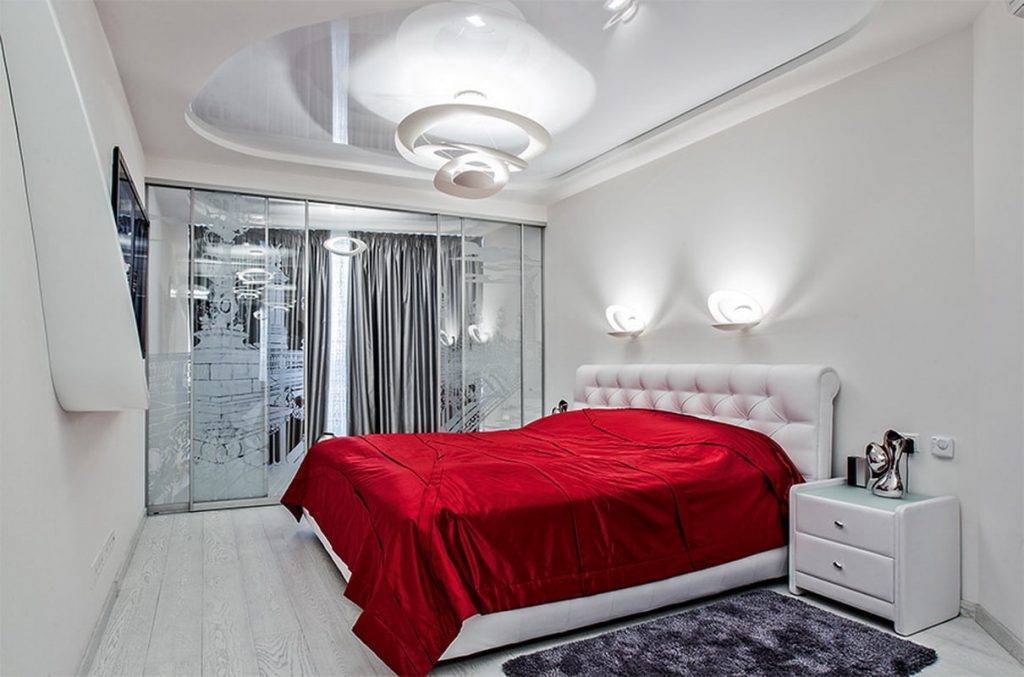 Декоративная подсветка также пригодится – светодиодную ленту пускают по периметру пола, потолка, шторному карнизу или шкафу. При наличии комода, шкафчика с прозрачными дверцами, свет делают и там. Такое освещение не должно быть слишком ярким, так как будет мешать нормальному сну. В качестве украшения выполняют целые картины на потолке, стенах, оформленные светодиодами – это ночные города, звездное небо, карта мира и др.